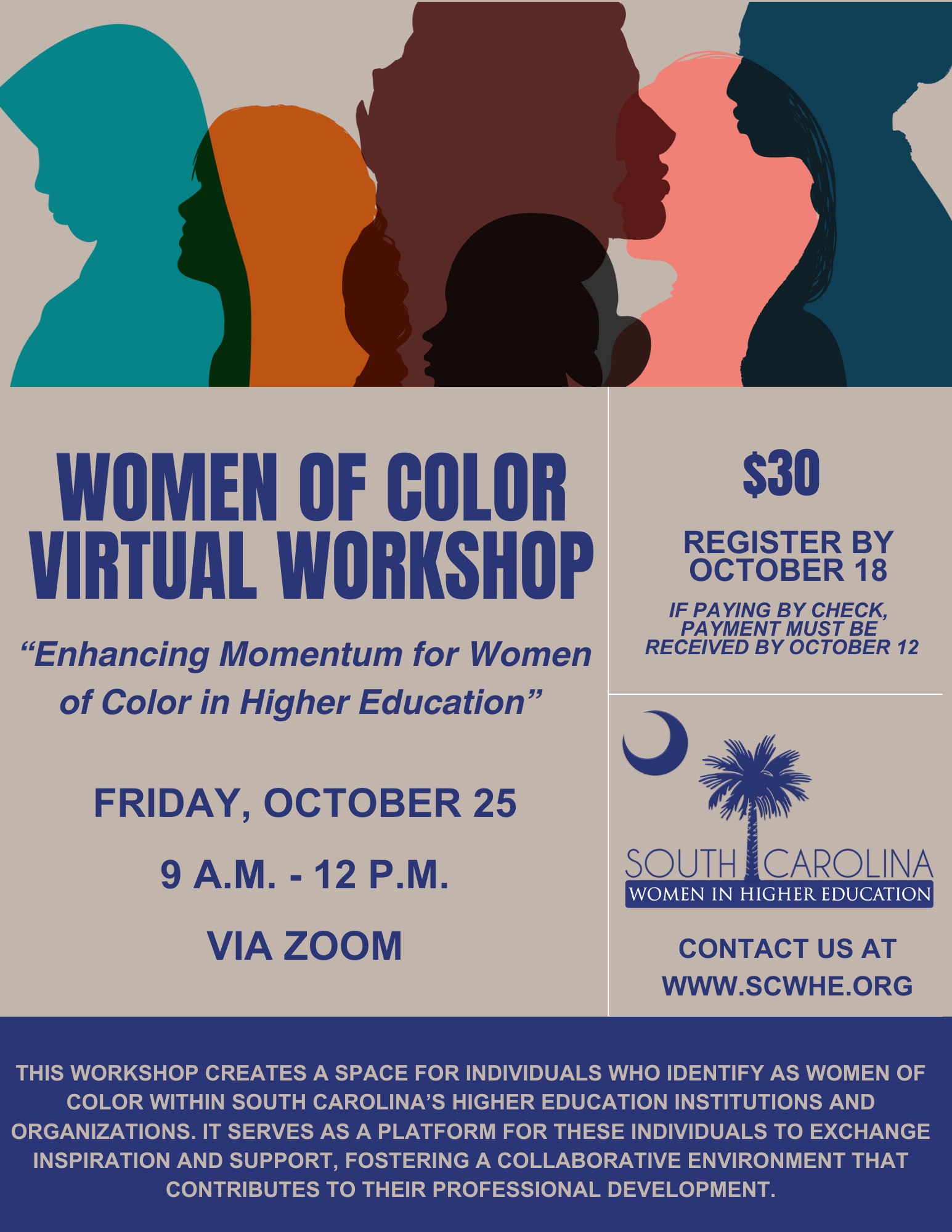 Annually conducted, this workshop creates a space for individuals who identify as women of color within South Carolina’s higher education institutions and organizations. It serves as a platform for these individuals to exchange inspiration and support, fostering a collaborative environment that contributes to their professional development.